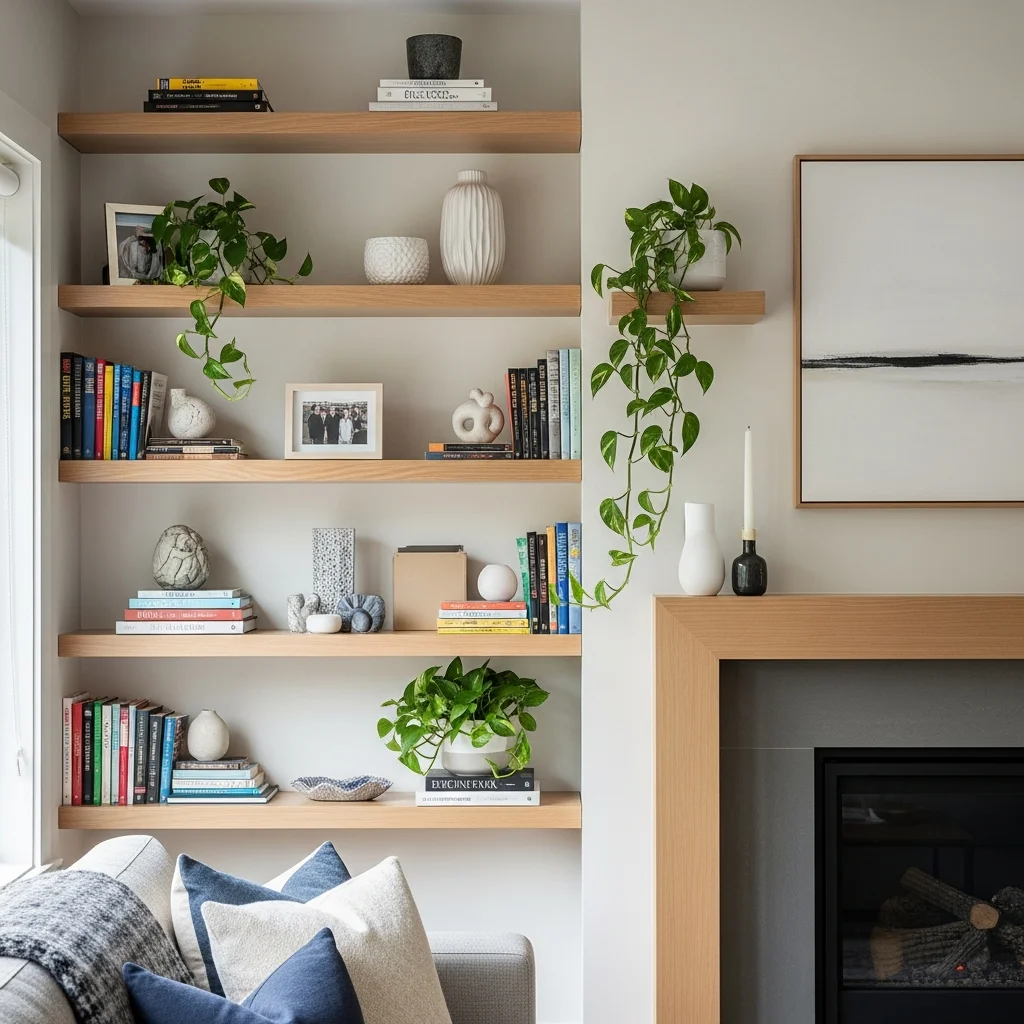 Open shelving transforms walls into opportunities for personal expression while providing practical storage. Style shelves with combinations of books, plants, decorative objects, and personal treasures that reflect your interests and experiences. Vary the heights and sizes of displayed items to create visual rhythm, and leave some empty space to prevent overwhelming density.