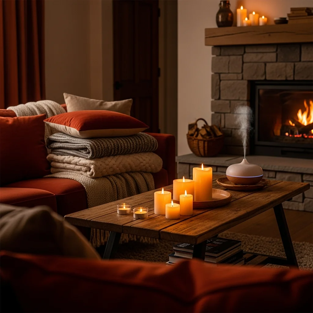 Scented candles in seasonal fragrances enhance ambiance while providing soft light. Essential oil diffusers offer aromatherapy benefits without flame risks. The gentle crackling of fireplaces adds soothing sound, as do small water features. These layered sensory experiences create comprehensive coziness that transcends purely visual design.
